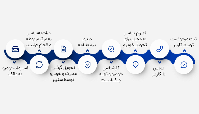 پس از ثبت درخواست و هماهنگی پشتیبانی با شما، سفیران کارپرداز در وقت مقرر به محل شما مراجعه می‌کنند و پس از بررسی مدارک و صدور بیمه نامه، خودروی شما را تحویل می‌گیرند و سرویس مورد نظر شما را انجام می‌دهند.